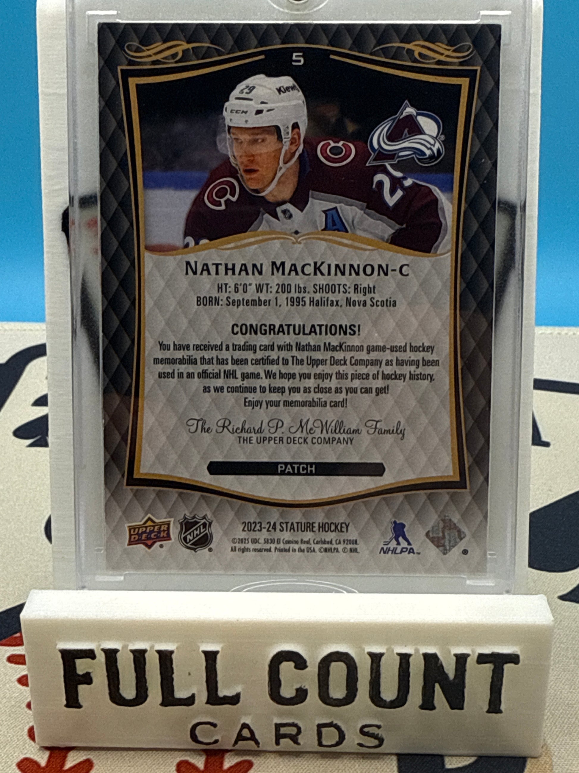 2023-24 UD Stature Nathan MacKinnon 3-Color Patch /49 Avalanche SSP