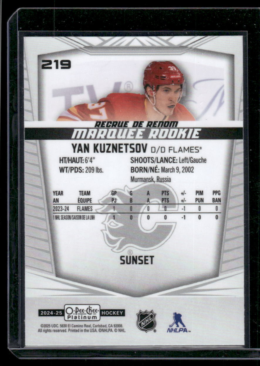This is a nice example of a 2024-25 O-Pee-Chee Platinum #219 Yan Kuznetsov Sunset Other important information about this card:In 2024 Yan Kuznetsov played for the Calgary Flames.Please check out our other listings for more great cards.