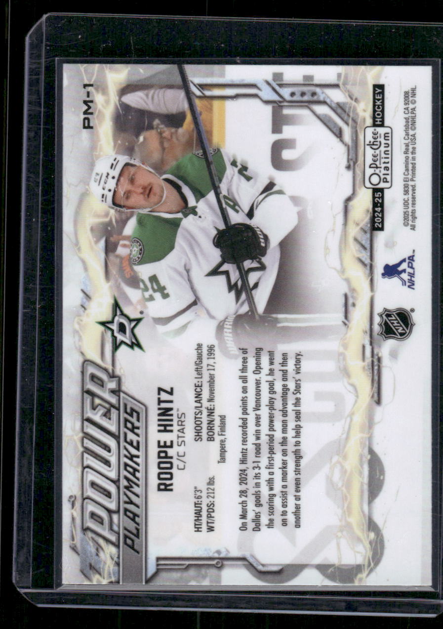 This is a nice example of a 2024-25 O-Pee-Chee Platinum #PM-1 Roope Hintz Power Playmakers Other important information about this card:In 2024 Roope Hintz played for the Dallas Stars.Please check out our other listings for more great cards.